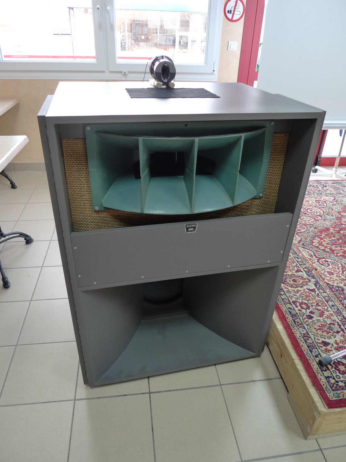 Les nouvelles VOTT ont été achetées à un monsieur qui possède 5-6 systèmes chez lui dont des RM 6 à double 38 + Kinoshita, des Onken, des Mini Onken… Il avait deux paires de VOTT dans sa cave auditorium, et vendait le tout. Un ami (celui qui fait mes filtres) m’avait mis sur le coup de ces VOTT qui ont fait, paraît il, une ou deux décennies dans un cinéma auparavant. Elles auraient été construites à la demande de l’importateur français fameux d’Altec dans les 80s : Serge (dont je ne sais plus le nom, désolé). Elles sont donc en contreplaqué « fin » de 2 cm, et noir de noir.