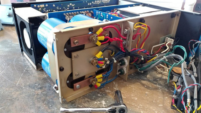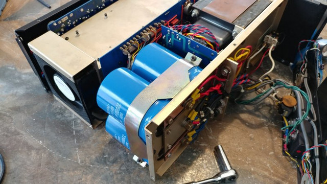 Sinon l'ampli est heureusement très sérieusement et solidement construit. Au passage le transformateur d'alimentation de 2,2KVA représente une bonne partie du poids de l'objet. Entre autres tâches, la totalité de la visserie, évidemment américaine #6-32 x 3/8" (FT) Coarse Thread SEMS, sera remplacée en neuf, et il faudra refabriquer le harnais de fixation des quatre capas de filrage 22.000µF/100V qui a disparu (cf photos), de même que leur bus de connexion. Bref, pas tout à fait une sinécure, c'est assez habituel avec ce genre de chantier, mais rien qui soit particulièrement effrayant ou insurmontable fors le nombre d'heures de travail plutôt conséquent.