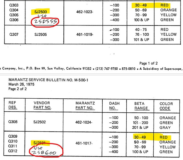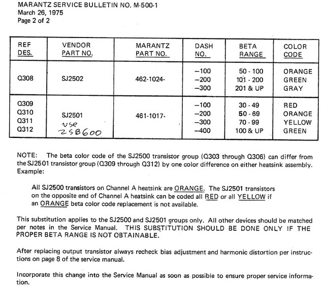 De nombreux témoignages d'anciens techniciens de SAV Marantz racontent la propension de cet ampli à exploser ses transistors de sortie très rapidement, les clients revenant en garantie après avoir écouté seulement deux plages de leur vinyle favori. La raison en est assez simple : les Motorola utilisés dans les premiers modèles étaient instables par construction, en raison d'une technologie encore mal maîtrisée. Un "Service Bulletin" Marantz de mars 1975 préconise d'ailleurs de les remplacer par un nouveau type de chez NEC (2SB600 et 2SD555) dont mon exemplaire est heureusement équipé.