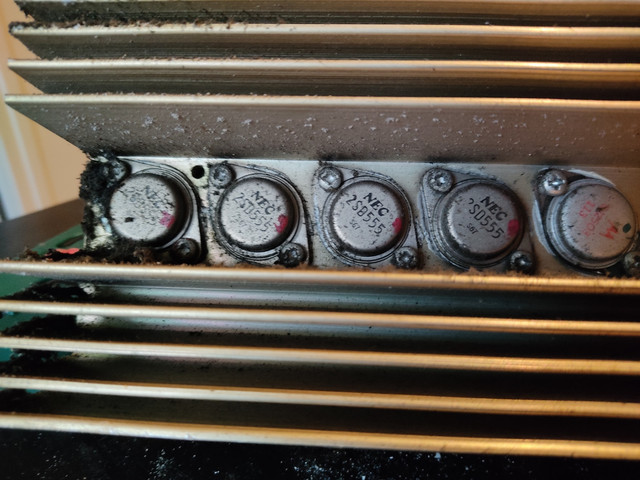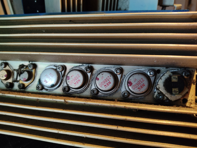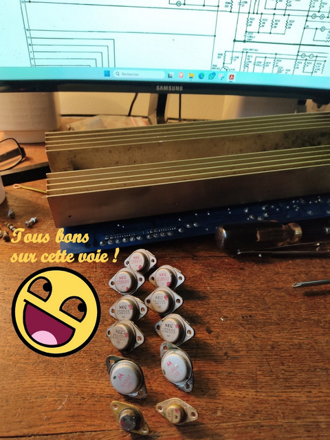 Les cinq fusibles étaient d'origine et intacts, ce qui est bon signe, j'avais un bon pressentiment et il était fondé : sur la voie testée tous les transistors sont en parfait état et qui plus est, ainsi que l'indique le codage par un point de peinture rouge, leur beta est dans les spécifications, ils sont donc bien appairés