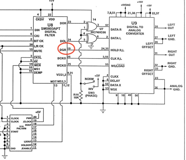 On voit un signal carré à 353khz (donc 44,1x8) sur la pin 24 du NPC SM8503. Le même que la Output Word Clock alors que je devrais avoir un signal fluctuant, pas régulier, un signal numérique. C’est une sortie DATA. Donc j’imagine qu’il y a un court-circuit dedans. A changer.