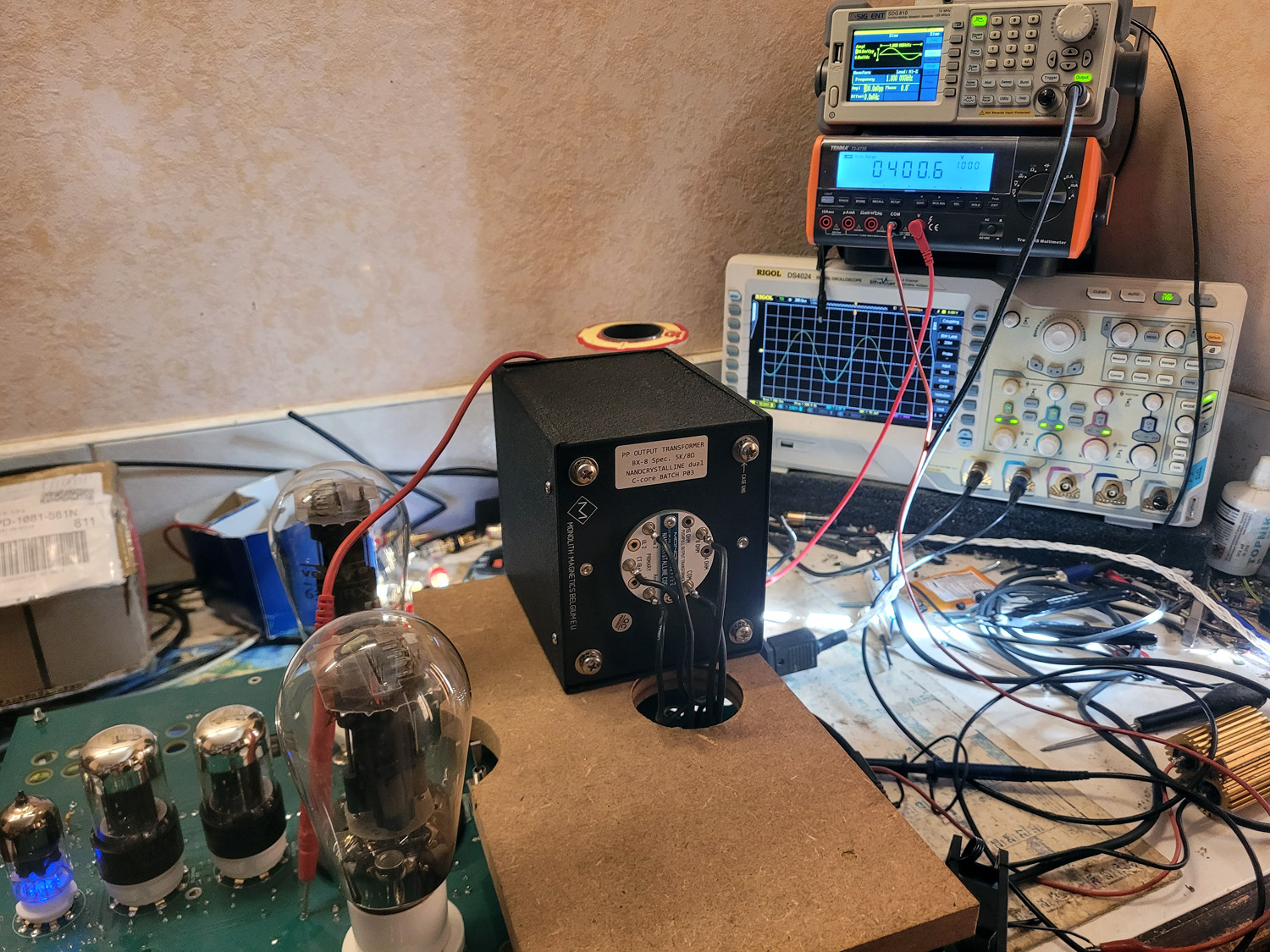 Et voici pour terminer, le test et rodage, avant insertion dans le coffret, de la deuxième paire qui utilisera le Monolith Magnetics en TR de sortie pour mon ami dont je dois faire un "grand" système 4 voies en bi-amp passive.