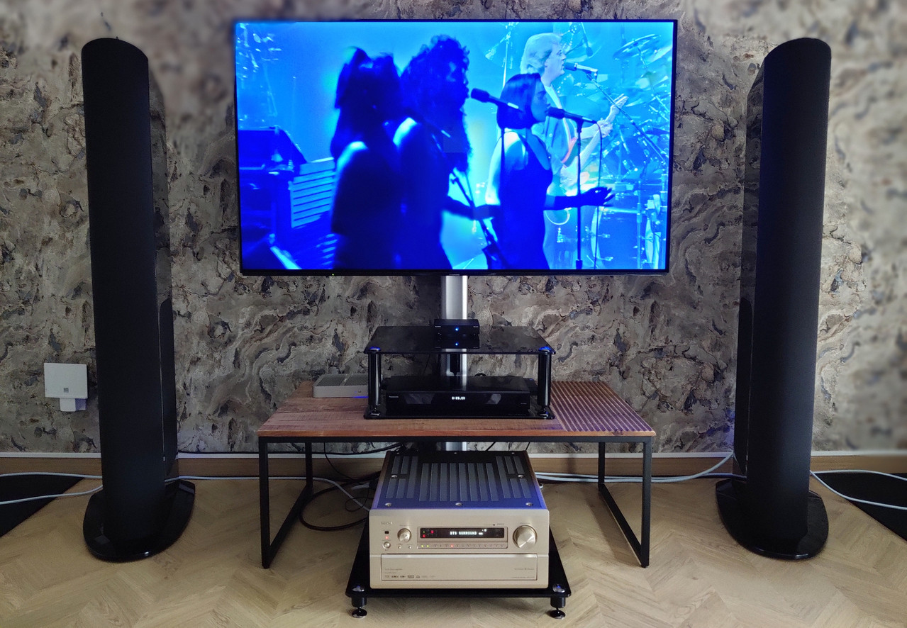 La solution est passée par des enceintes semi-actives, en l'occurence des GOLDENEAR Triton référence qui me permettent de correctement traiter le grave. Grandes colonnes de 1,50 m et 50 Kg, mais qui se fondent aisément dans le décors.